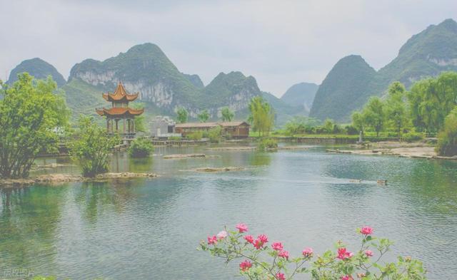 泉水清得能看见下面的水草摇曳,喀斯特峰林之间的村庄、田园一片安逸。山上有个观景台,俯视整个鹅泉宛如一幅水墨画。石桥散步,静静感受美丽山水,就已经很舒适了。