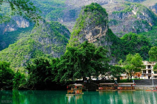 碧绿的河水、奇特的天坑、神秘的溶洞,山水相依。